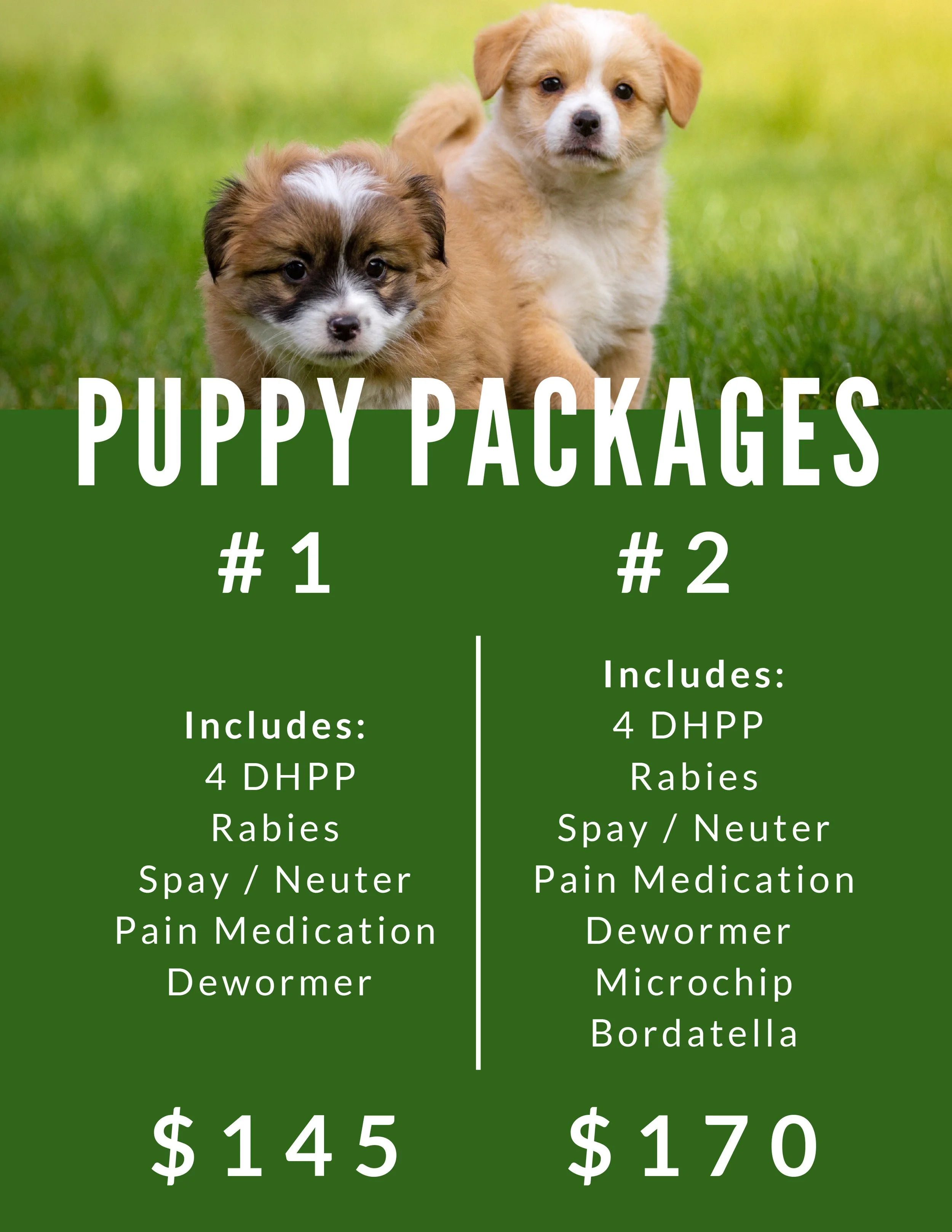 Includes: 4 DHPP, Rabies at 16 weeks, Spay/neuter, Dewormer, pain meds for post surgery, Microchipping, and Bordatella.